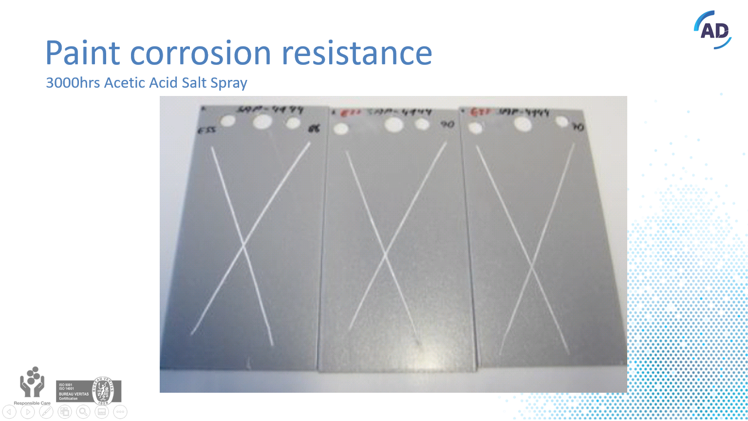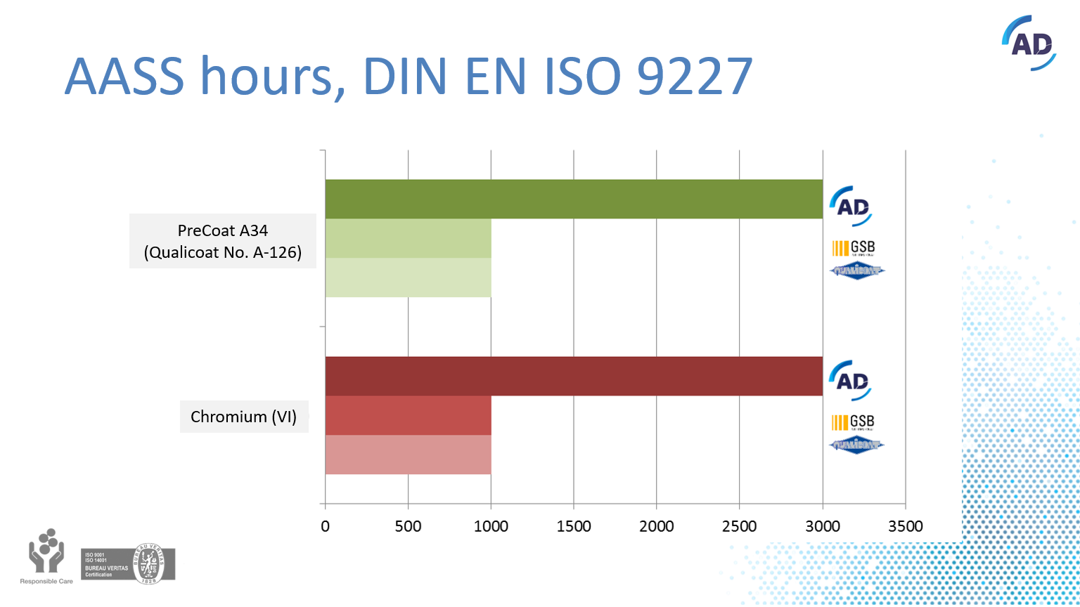 AD Chemicals doubts this statement of Qualicoat. When you only focus on the 1008 hours corrosion resistance, that has been described in the past, Qualicoat is right. However, the corrosion resistance of chromium (VI) based pretreatments fulfills the 2500 hours. This was a fair value for Chromium (VI) based pretreatments on Aluminium. AD Chemicals has investigated their chromium-free systems on the corrosion resistance of 3024 hours and compared it with the traditional chromium(VI) systems.