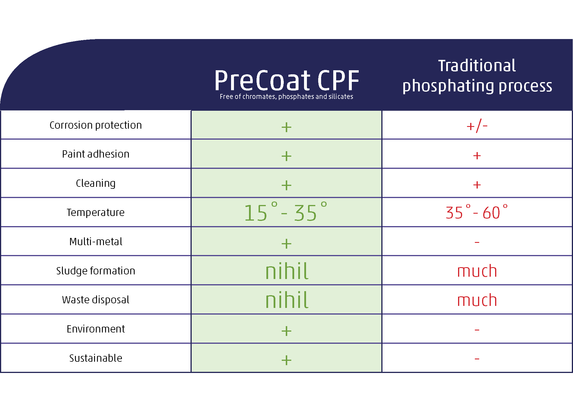 Use PreCoat CPF to save costs on pretreatment by replacing your traditional iron phosphating processes. With PreCoat CPF you can achieve a more sustainable, qualitatively improved, and environmental friendlier process. Moreover, you can improve the level of the corrosion protection and paint adhesion.