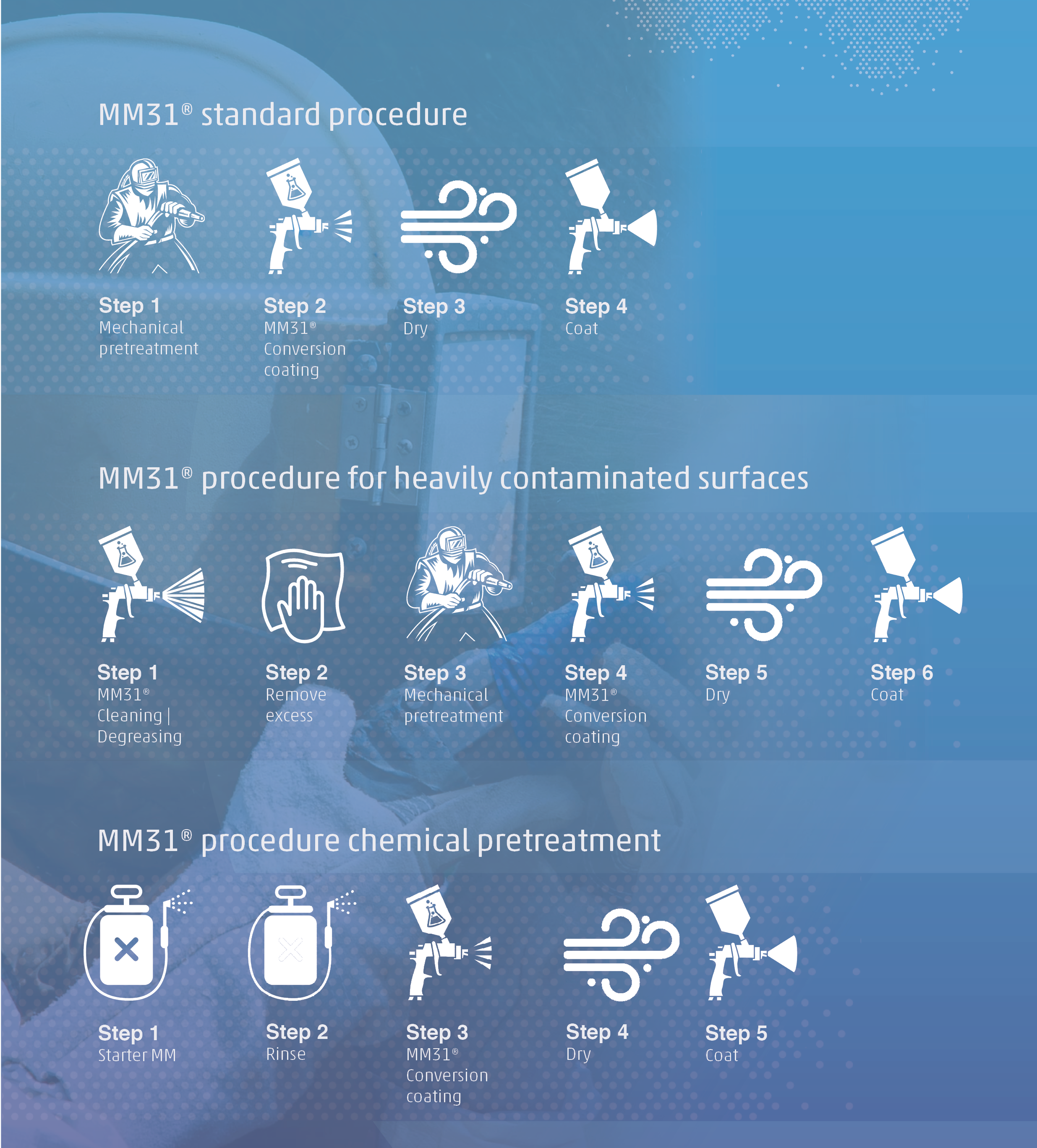In the field of pre-treatment methods, mechanical pre-treatment (such as blasting or sanding) followed by a coating system is common. What if mechanical pre-treatment could be combined with the added value of chemical pre-treatment? This was the starting point for the development of MM31®.